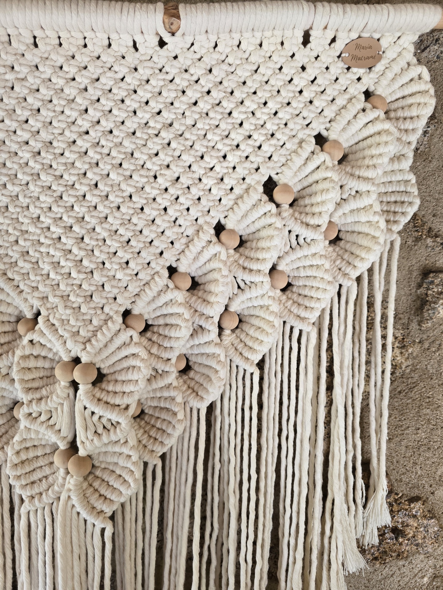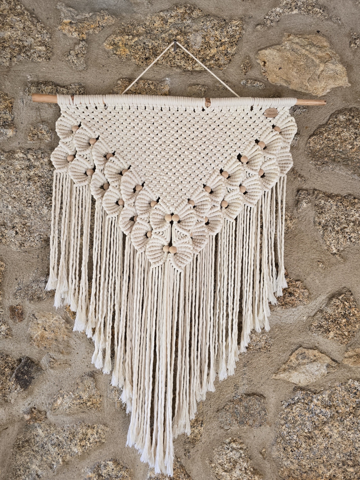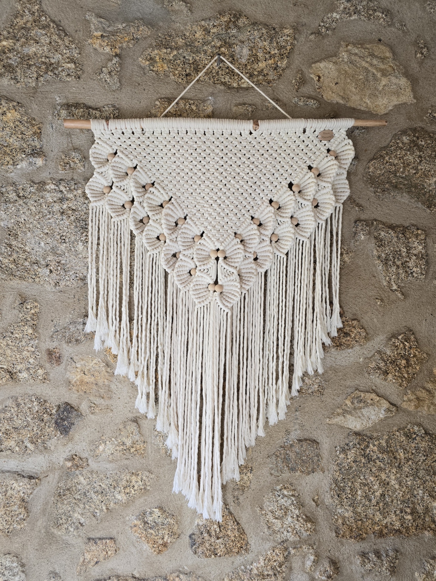 Foram utilizados diferentes tipos de nós que trouxeram um destaque particularmente atrativo devido à formação de flores enriquecidas com missangas de madeira.