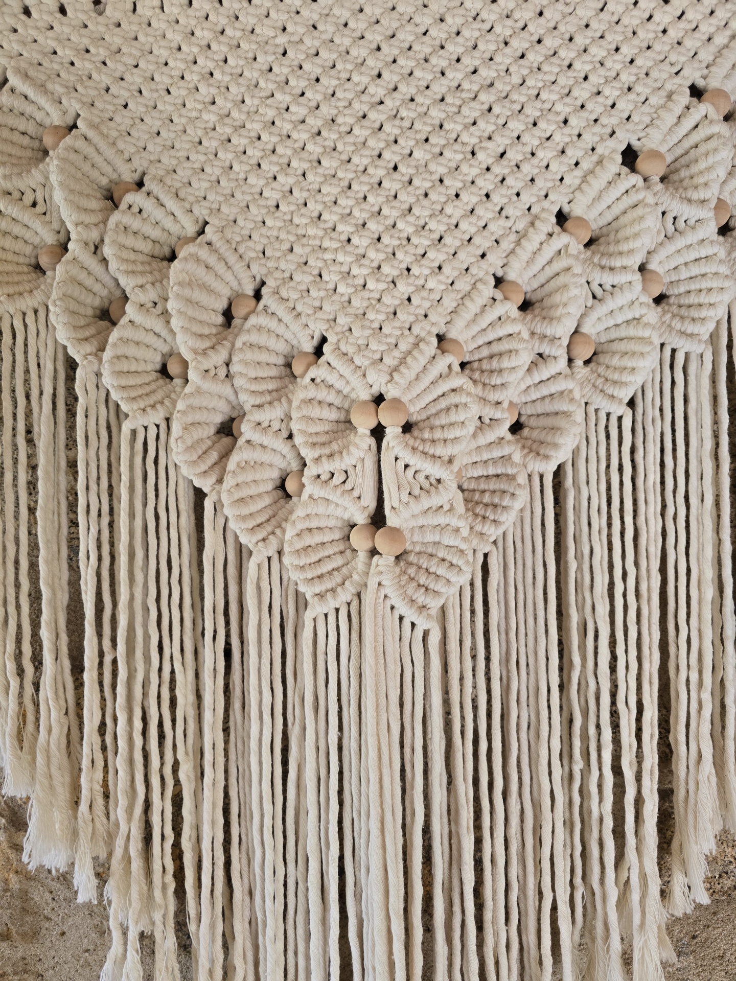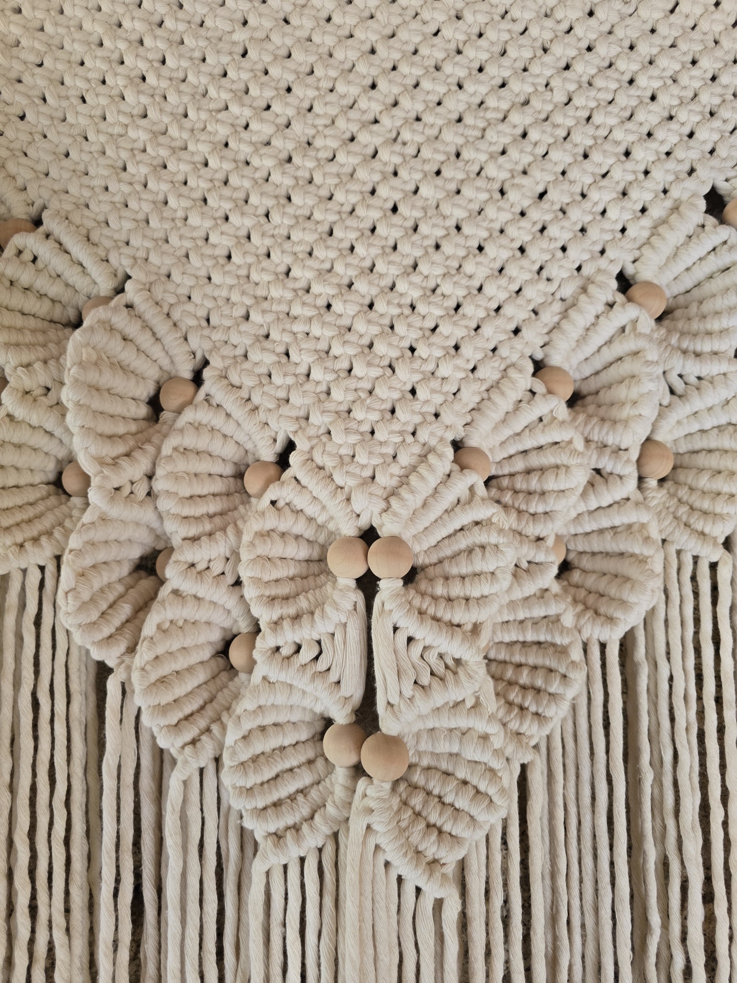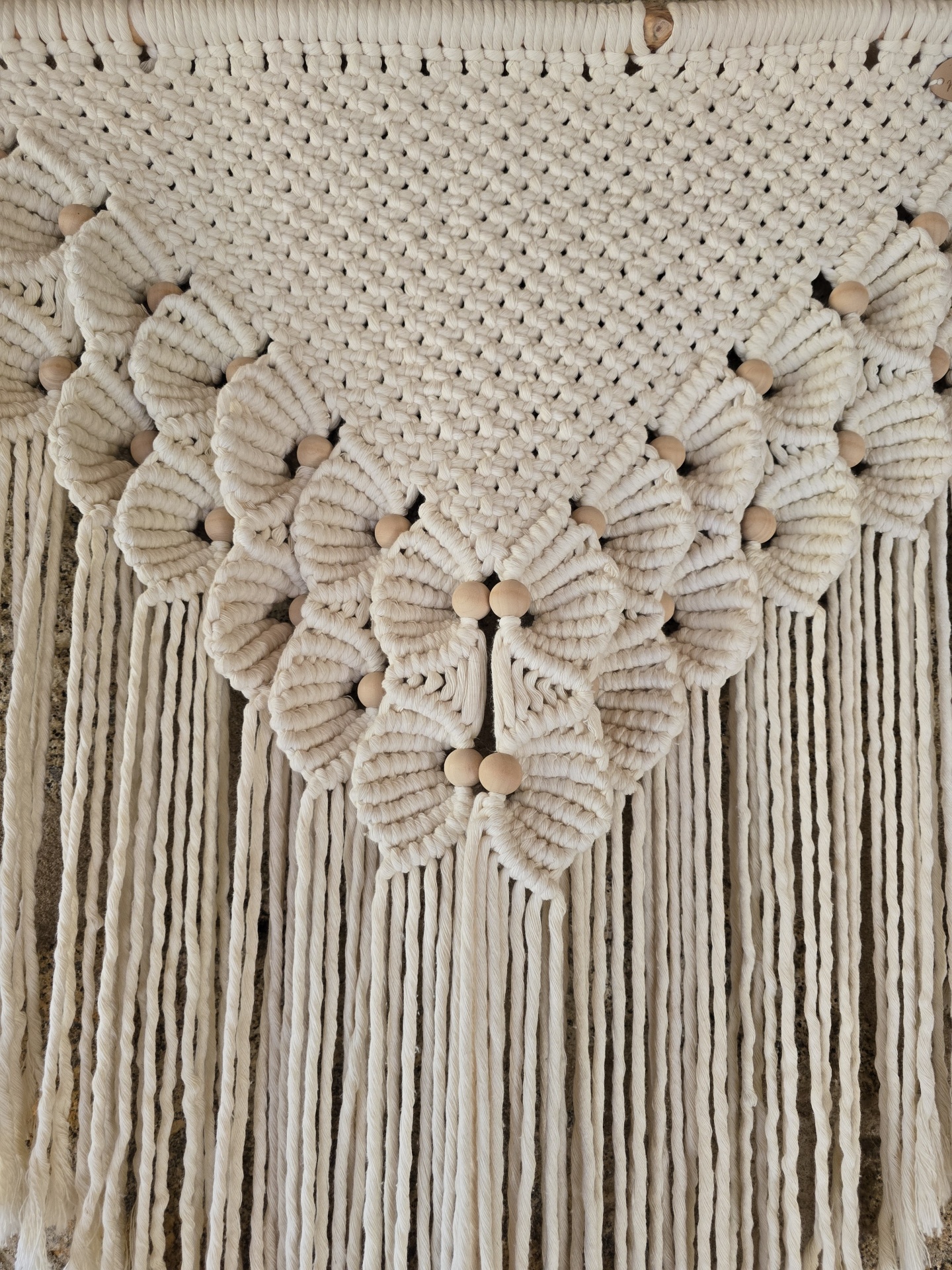 Foram utilizados diferentes tipos de nós que trouxeram um destaque particularmente atrativo devido à formação de flores enriquecidas com missangas de madeira.